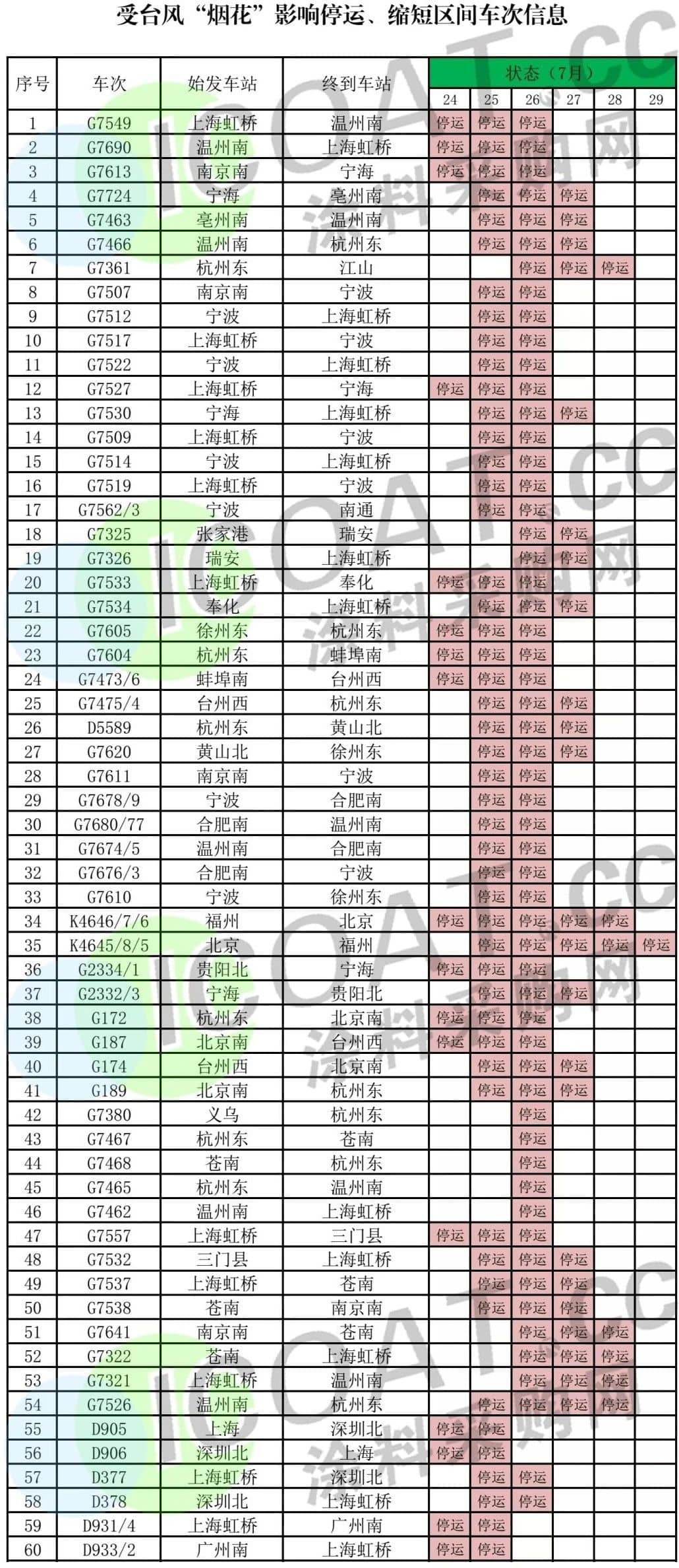 为应对今年第6号台风“烟花”可能带来的影响,确保旅客列车运行安全 ,铁路部门决定自7月24日至29日,对部分列车采取临时停运措施。