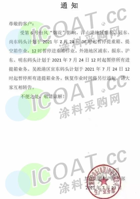 尽管多地已提早做好准备进行防洪抗汛,但“烟花”来势汹汹,对于华东多个省市地区的化工企业及海、陆、空运输仍带来了重创。江苏多数码头、浙江宁波和乍浦等地提前进入了封航状态,暂停一切外轮进港卸货作业,长江主港地区也进入封航状态。市场货源流通受阻,采购进货和销售出货都几近暂停,同时下游工厂也相应处于停工状态。