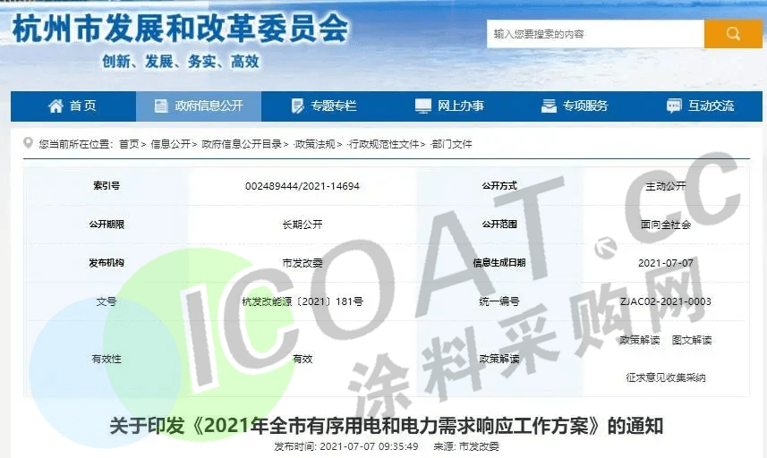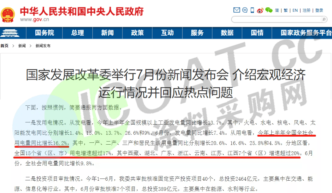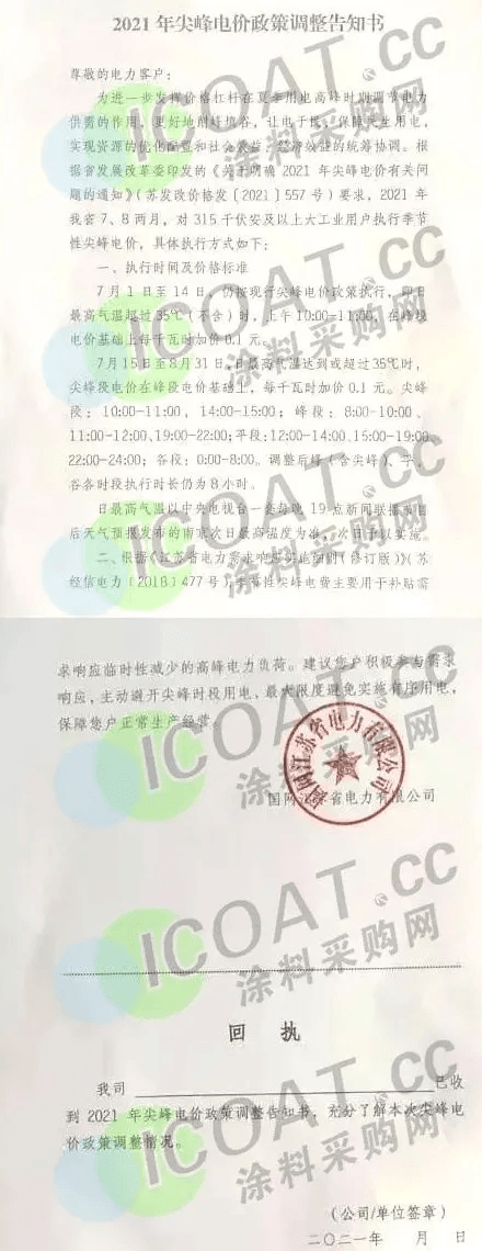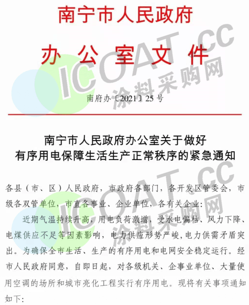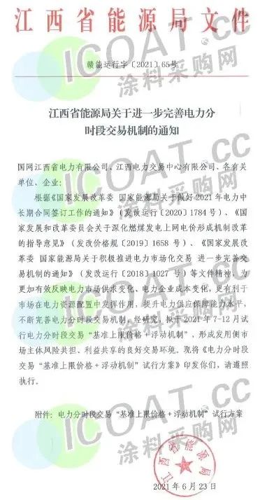 据涂料采购网了解,2021年以来全国用电需求持续快速增长,下半年气温不断攀升,多地发布高温预警,7月上旬全国用电负荷和日发电量均已经突破去年夏季峰值,局部地区高峰时段电力供需偏紧。为确保平稳迎峰度夏,浙江、江苏、安徽、云南、内蒙等多个省市地区采取了提高尖峰电价、工业企业限电、错峰轮休、降低用电量等方式,多措并举缓解电力供需矛盾。