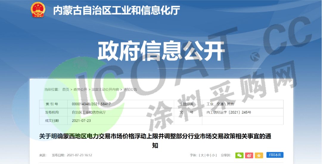 内蒙古工信厅下发《关于明确蒙西地区电力交易市场价格浮动上限并调整部分行业市场交易政策相关事宜的通知》(内工信经运字〔2021〕245号),自2021年8月起,蒙西地区电力交易市场燃煤发电电量成交价格在基准价(每千瓦时0.2829元)的基础上可以上浮不超过10%(上限为每千瓦时0.3112元)。