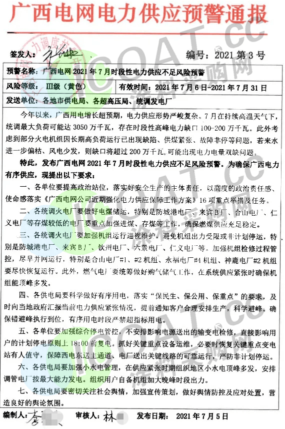 广西电网发布电力供应预警通报,要求个供电局做好有序用电,提前通知客户合理安排生产,科学避峰,确保错峰避峰执行到位,有序用电时段严禁超标用电。