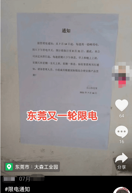 自5月开始,广东广州、佛山、东莞、惠州等十几个城市启动了有序用电,各类OEM/ODM工厂和大部分制造企业被要求错峰用电,限时生产。目前广东部分地区企业接到错峰轮休通知,要求特定时间停止一切生产用电。
