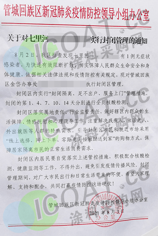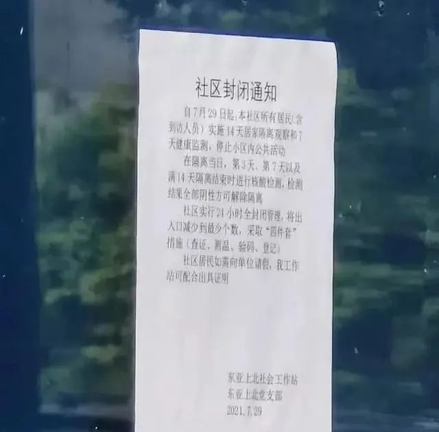 东亚上北社区工作站发布了封闭通知,自7月29日起,实施14天居家隔离观察和7天健康监测,停止小区内公共活动,在隔离当日,第3天、第7天以及满14天隔离结束时进行核算检测,检测结果全部阴性方可解除隔离。