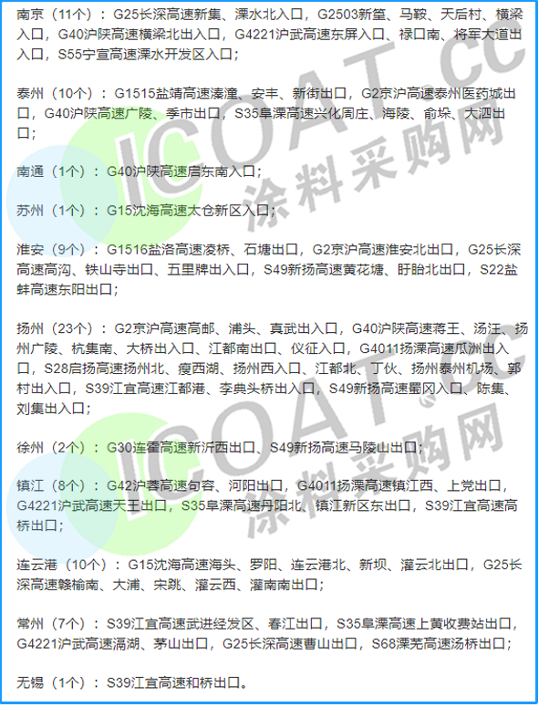 目前,江苏南京、泰州、南通、苏州、淮安等地区83个高速公路收费站出口或入口暂时关闭。此外,江苏省内的大学、中学和小学均实行封闭管理。