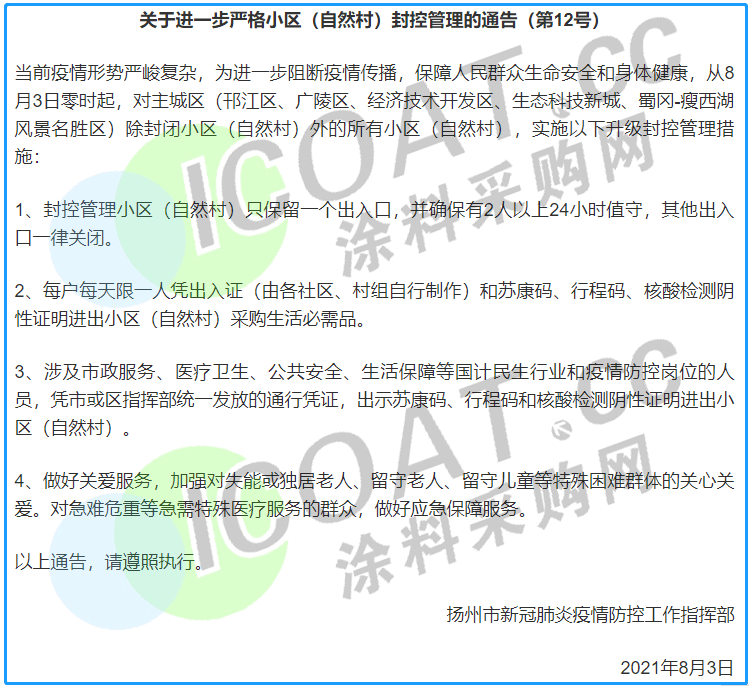 从8月3日零时起,对主城区(邗江区、广陵区、经济技术开发区、生态科技新城、蜀冈-瘦西湖风景名胜区)除封闭小区(自然村)外的所有小区(自然村),实施升级封控管理措施。封控管理小区(自然村)只保留一个出入口,并确保有2人以上24小时值守,其他出入口一律关闭。每户每天限一人凭出入证(由各社区、村组自行制作)和苏康码、行程码、核酸检测阴性证明进出小区(自然村)采购生活必需品。