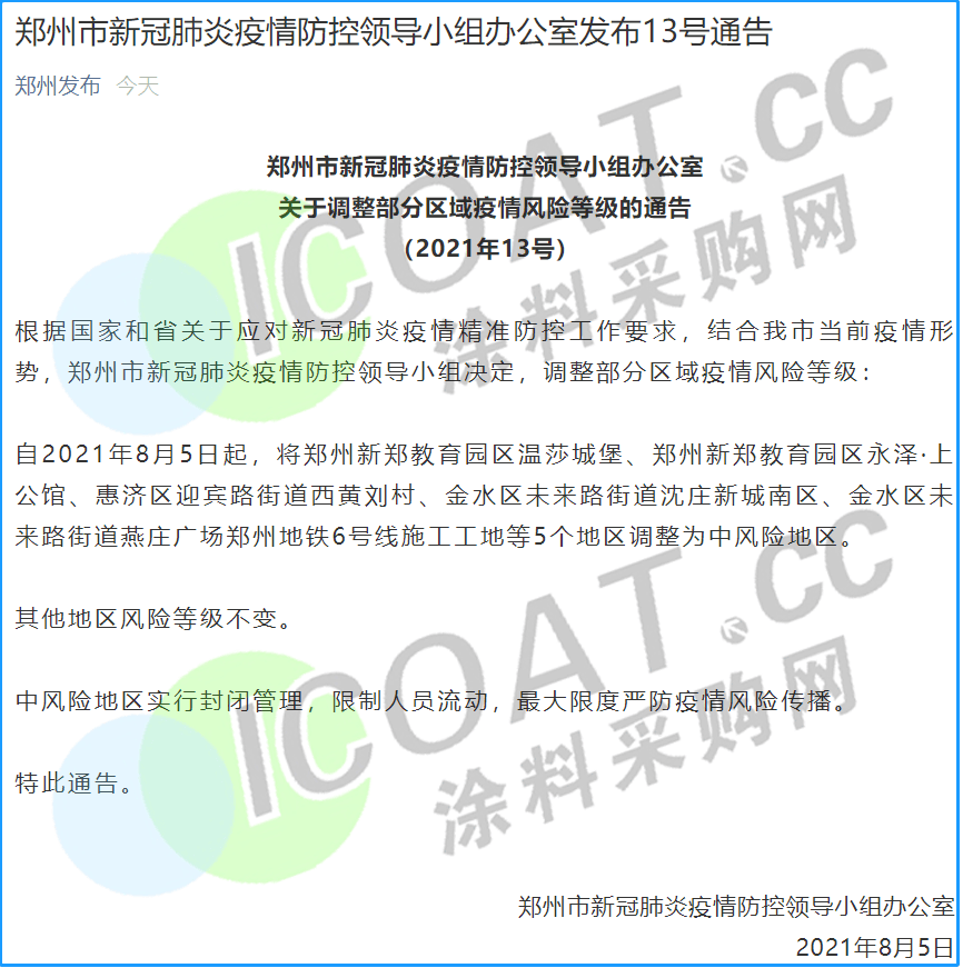 自2021年8月5日起,将郑州新郑教育园区温莎城堡、郑州新郑教育园区永泽·上公馆、惠济区迎宾路街道西黄刘村、金水区未来路街道沈庄新城南区、金水区未来路街道燕庄广场郑州地铁6号线施工工地等5个地区调整为中风险地区,其他地区风险等级不变。中风险地区实行封闭管理,限制人员流动,最大限度严防疫情风险传播。