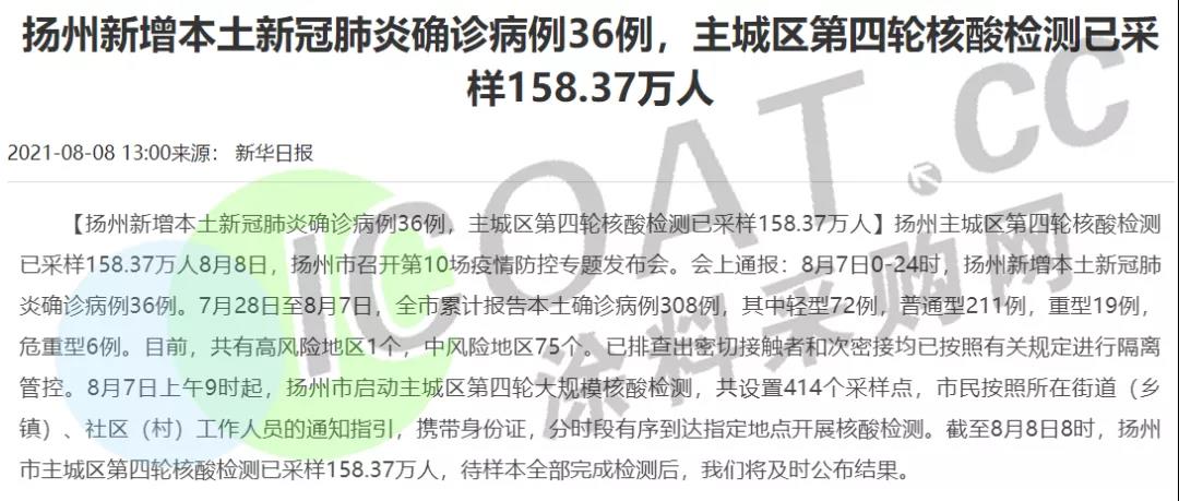 江苏扬州:8月7日上午9时起,扬州市启动主城区第四轮大规模核酸检测,共设置414个采样点。