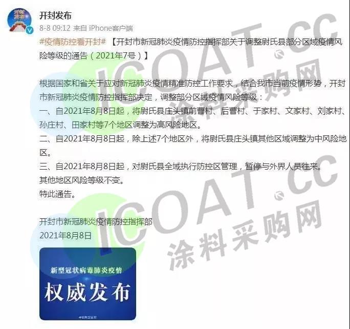 河南开封:自2021年8月8日起,将尉氏县庄头镇前曹村、后曹村、于家村、文家村、刘家村、孙庄村、田家村等7个地区调整为高风险地区;除上述7个地区外,将尉氏县庄头镇其他区域调整为中风险地区。对尉氏县全域执行防控区管理,暂停与外界人员往来。