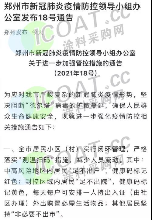 河南郑州:全市居民小区(村)实行闭环管理,严格落实“测温扫码”措施,减少人员流动。其中:中高风险地区内居民“足不出户”,健康码标记红色;封控区域内居民“足不出院”,健康码标记黄色,每天每户可安排一人持出入证(由社区办理)外出购置必需生活物品;其他居民坚持“非必要不出市”。