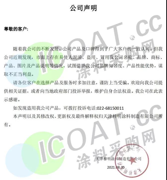为了解具体情况,涂料采购网第一时间与天津梓明涂料王总进行了进行核实。王总表示这种情况并不是首次出现,前几年在湖北、河南、山东等多个地区出现了同行企业名称中包含“梓明”字样,或与“梓明”同音不同字的情况,给当地消费者带来了困扰和误导。这种情况在近期更是屡次发生,为了维护企业合法权益,更为了保护消费者和使用者免受损失,天津梓明涂料决定发函声明这个严重的问题。
