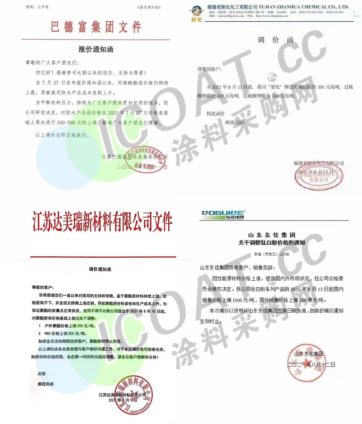 上游方面自不必说,近几年原材料涨价一波几折一波,今年更甚。钛白粉累计涨幅超过50%,价格创4年新高,颜料产品动辄一单一议,单次调涨近1000元/吨;固化剂频频断货,价格翻倍,其原料异氰酸酯每季度增长两位数;环氧树脂创下10余年新高,聚酯树脂也在下半年呈现出直冲云霄之势。溶剂价格涨超50%,乳液产品年内上涨近3000元/吨,填料企业更是破天荒的屡屡发函调涨。如此算来,涂料企业成本方面每吨增加超过万元。