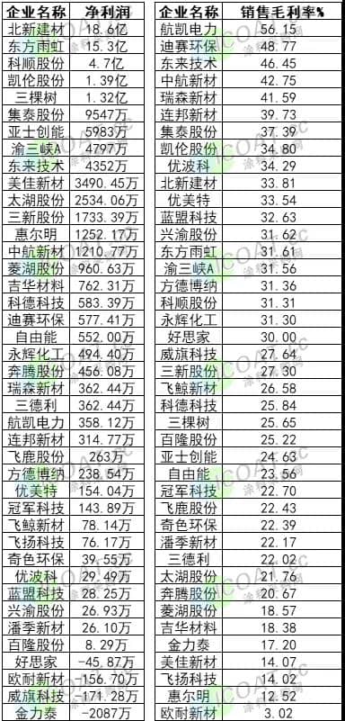 据涂料采购网不完全统计,在41家涂料行业上市公司(含新三板挂牌企业)中,37家企业上半年经营状况为盈利,其中北新建材(18.6亿元)、东方雨虹(15.3亿元)、科顺股份(4.7亿元)、凯伦股份(1.39亿元)、三棵树(1.32亿元)占据净利润排行榜前五名的位置,且在毛利率排行榜中,这几个企业也占据了靠前的位置。不难看出,这几家企业都有一个共同的特点,就是与防水行业相关。