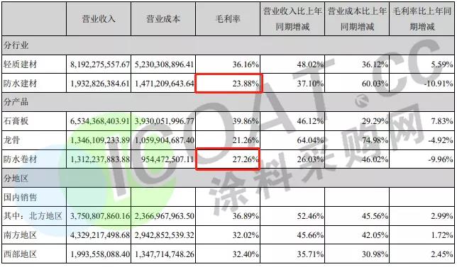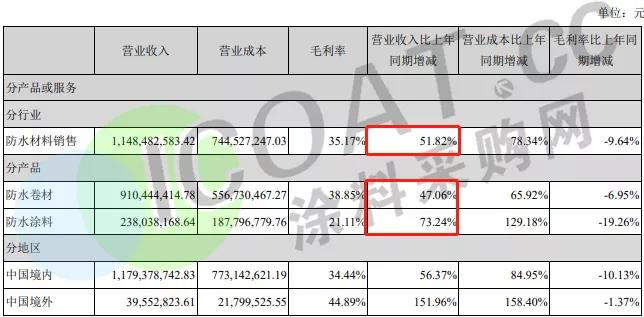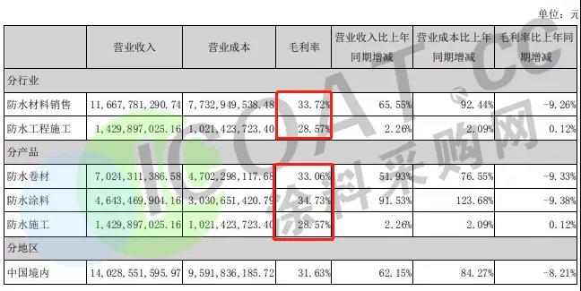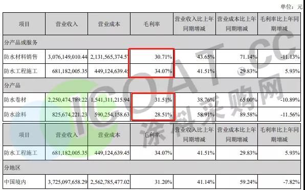 在毛利率方面,东方雨虹为31.61%。防水材料销售行业毛利率为33.72%,防水工程施工行业毛利率为28.57%;防水卷材产品毛利率为33.06%,防水涂料产品毛利率为34.73%。