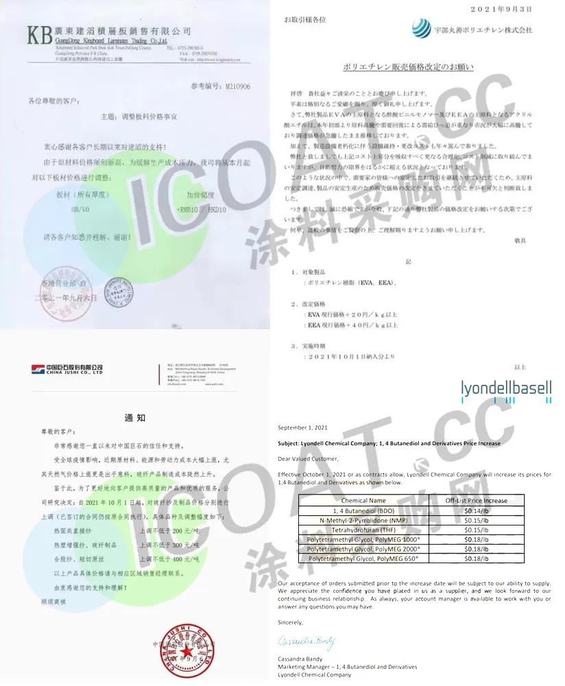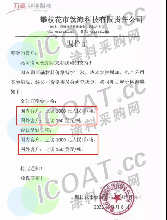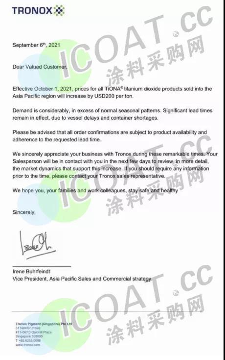 而在此前,钛白粉巨头特诺发函,称10月1日起,特诺钛白粉销往亚太地区的产品将涨价200美元/吨(约合人民币1291元/吨)。