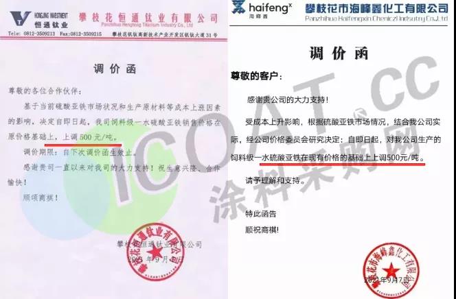 恒通钛业、海峰鑫化工也陆续宣布,饲料级一水硫酸亚铁销售价格在原价基础上上调500元/吨。
