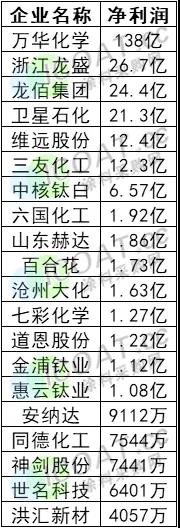 据涂料采购网不完全统计,化工原材料行业,生产钛白粉、染料、颜料、MDI、TDI、环氧树脂、聚酯树脂等产品的20余家上市公司净利润均较高。万华化学(138亿)、浙江龙盛(26.7亿)、龙佰集团(24.4亿)位居原材料净利润榜前三强位置。卫星石化、维远股份等15家化工上市公司净利润超过1亿元,安纳达、中核钛白等5家化工上市公司净利润超过1000万元,不可谓不惊人。