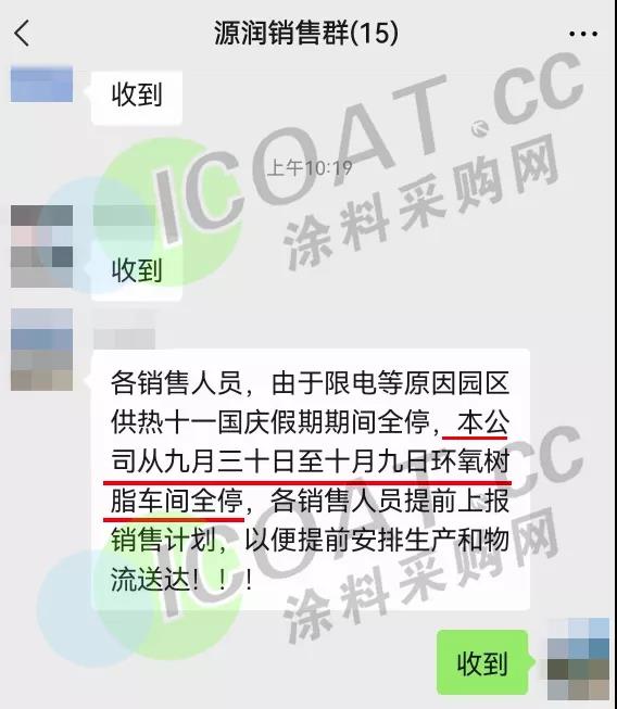 黄山源润新材料表示,由于限电等原因园区供热十一国庆假期期间全停,从9月30日至10月9日环氧树脂车间全停。提醒有需求的客户及时联系,以便提前安排生产和物流送达。