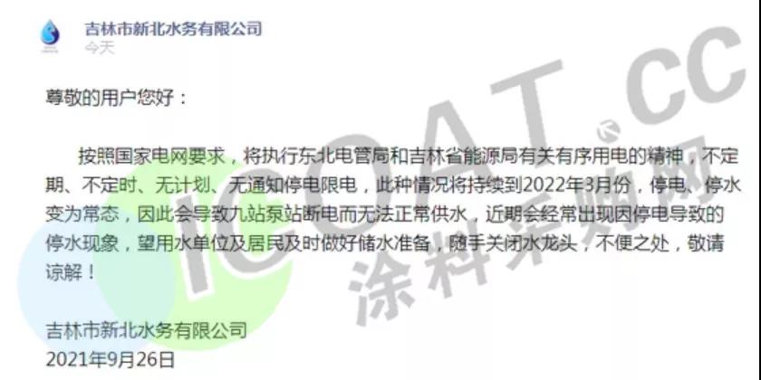 吉林市新北水务有限公司消息,按照国家电网要求,将执行东北电管局和吉林省能源局有关有序用电的精神,不定期、不定时、无计划、无通知停电限电,此种情况将持续到2022年3月份,停电、停水变为常态,因此会导致九站泵站断电而无法正常供水,近期会经常出现因停电导致的停水现象,望用水单位及居民及时做好储水准备,随手关闭水龙头。