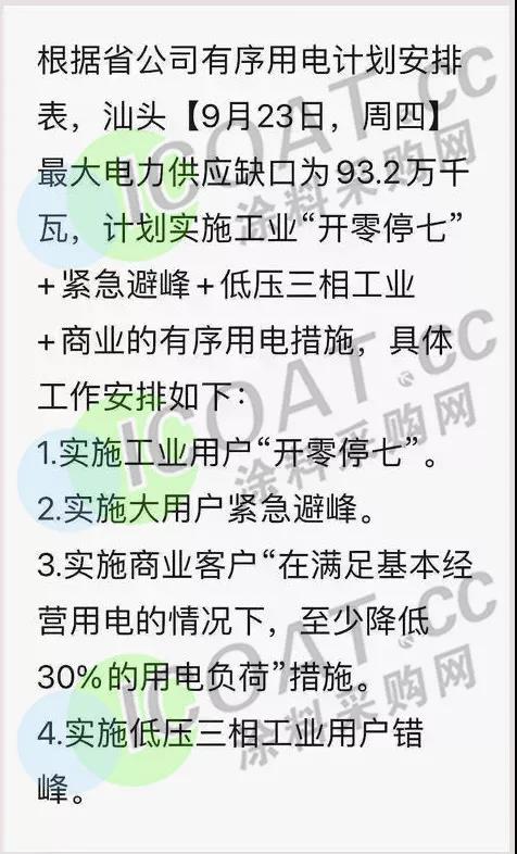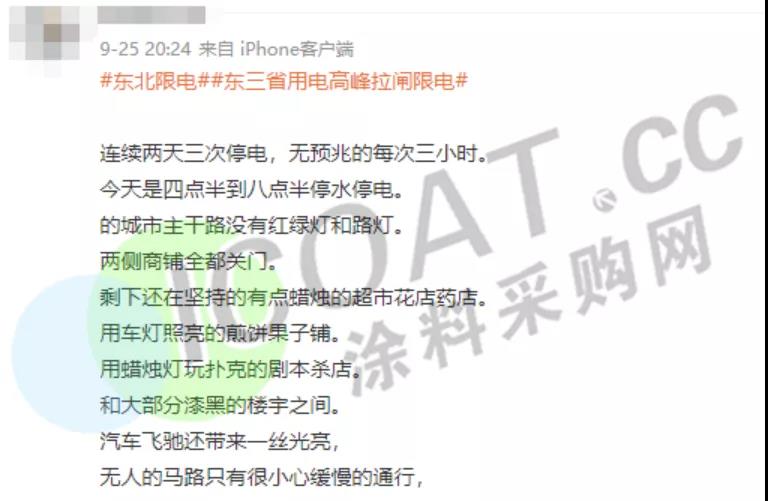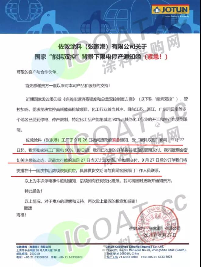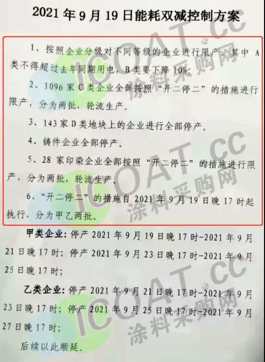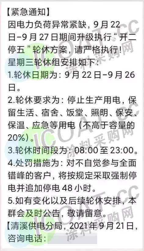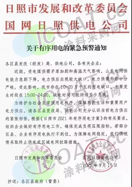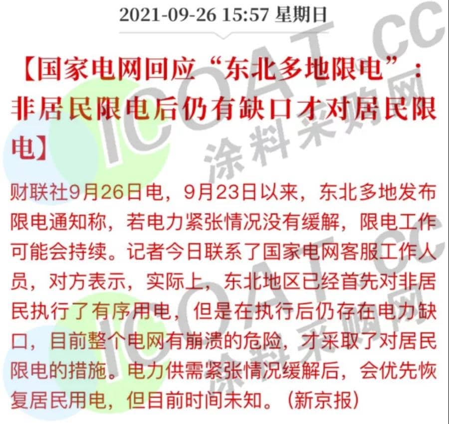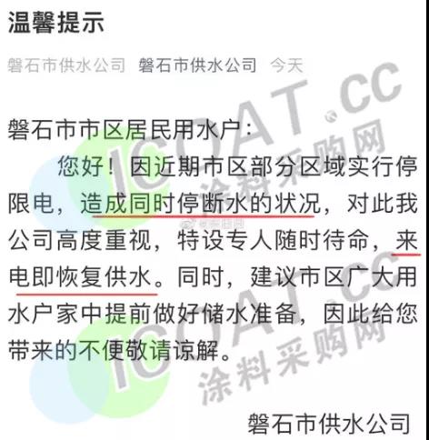 此轮限电已涉及到全国近20多个省,数万家企业受此影响。但据涂料采购网了解,目前已经不是限电那么简单了,部分地区因限电导致水都无法正常供应,真正出现了限电断水的情况,尽管部分地方做了相关的回应,但实际情况并不是很乐观。