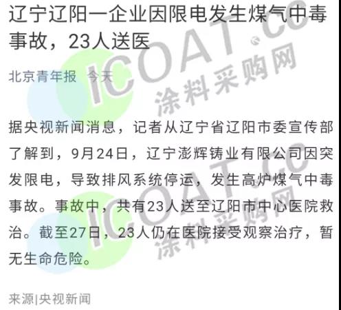 辽宁沈阳一企业因突发限电导致排风扇停运,发生高炉煤气中毒事故,23人送医并接受观察治疗。