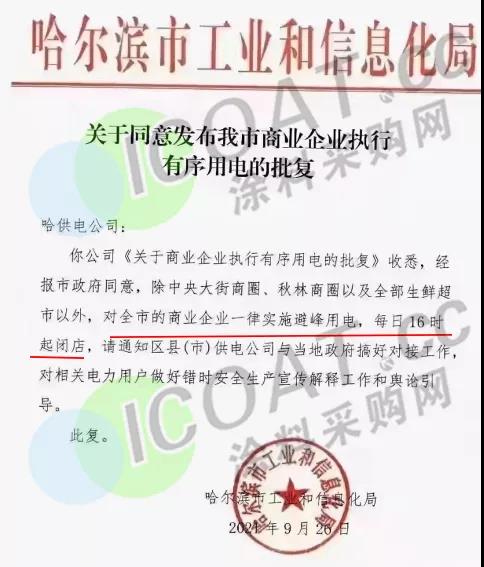 哈尔滨市工信局发布批复文件,称除中央大街商圈,秋林商圈以及全部生鲜超市以外,对全市的商业企业一律实施避峰用电,每日16时起闭店,请通知区县(市)供电公司与当地政府搞好对接工作。