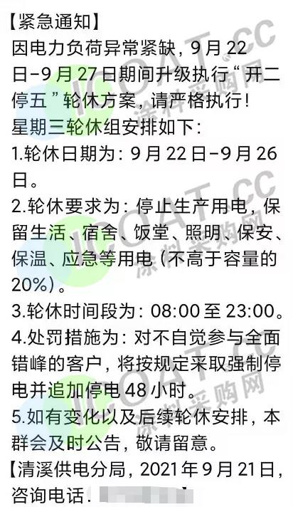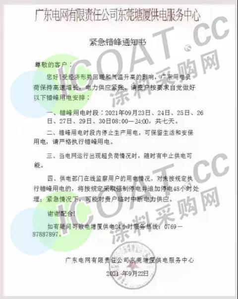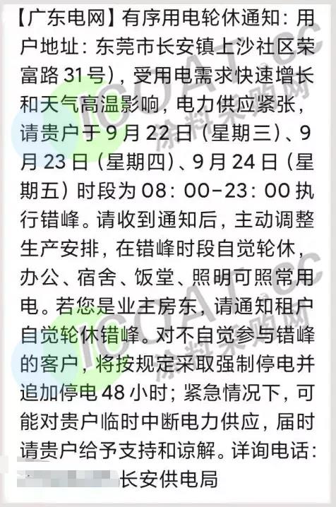 东莞,工厂普遍接到开二停五的通知,广东中山,规模以下企业开一停六,规模以上开二停五,高级优保企业开四停三。广东电网通知显示,于9月16日起执行“开二停五”限电措施,错峰期间,保安负荷保留在总负荷15%以下,错峰时间为7:00-23:00。若不配合,将面临10天查封处理!