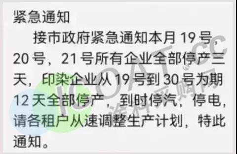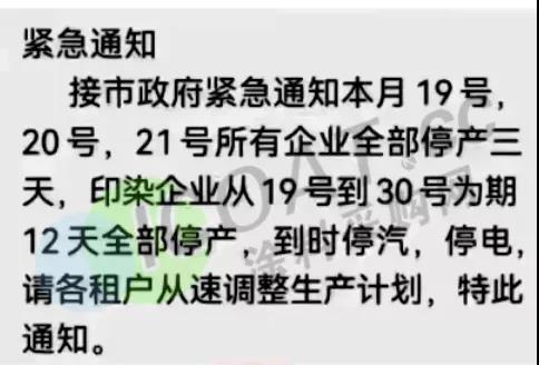 从江苏吴江地区传出的一份印染企业的停产时间汇总来看,企业普遍是“开二停二”。在南通,有企业发布了长达17天的放假通知。