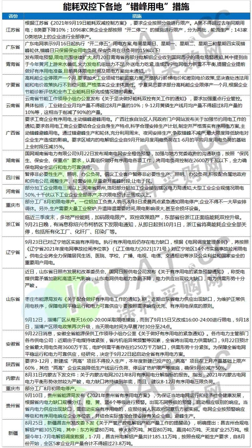 与往年夏季用电高峰时期的错峰用电政策不同,此次限电,“能耗双控”多次被提及。时间紧任务重,面对能耗“双控”目标考核,十几个省市地区出台“军令状”,从5月份广东“开五停二”,到六月份“开三停四”,再到9月份“开一停六”,减产90%,企业放假,居民停电……上到A股上市公司,下到中小型加工厂,从工业到民用,从限制到全停,限电波及的范围也越来越广。