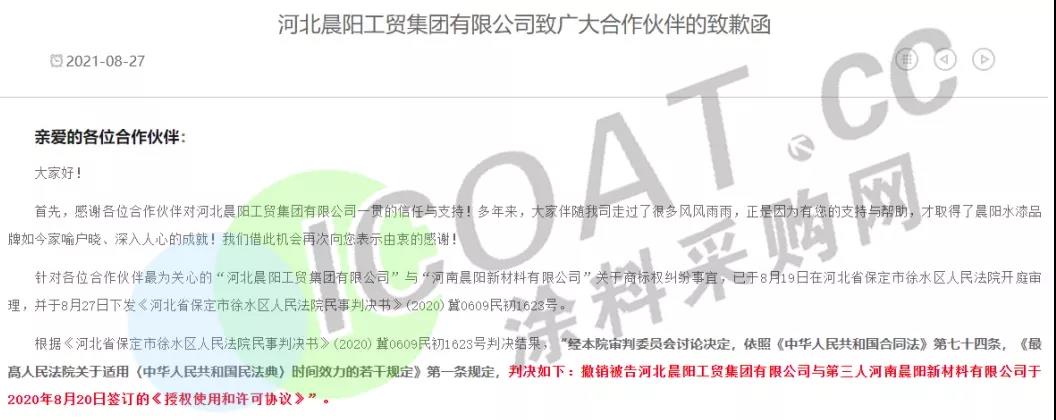 而在此之前,晨阳工贸集团发布消息称:针对各位合作伙伴最为关心的“河北晨阳工贸集团有限公司”与“河南晨阳新材料有限公司”关于商标权纠纷事宜,河北省保定市徐水区人民法院于近日开庭审理,并下发《河北省保定市徐水区人民法院民事判决书》(2020)冀0609民初1623号。
