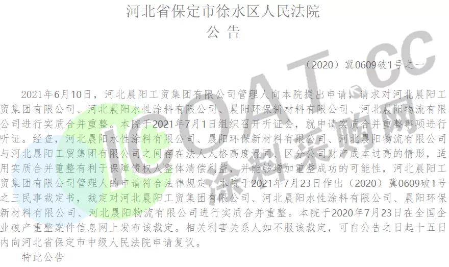 2021年6月10日,河北晨阳工贸集团有限公司管理人向徐水区人民法院提出申请,请求对河北晨阳工贸集团有限公司、河北晨阳水性涂料有限公司、晨阳环保新材料有限公司、河北晨阳物流有限公司进行实质合并重整。经过一个多月的论证评估,于2021年7月23日作出(2020)冀0609破1号之三民事裁定,对河北晨阳工贸集团有限公司、河北晨阳水性涂料有限公司、晨阳环保新材料有限公司、河北晨阳物流有限公司进行实质合并重整。