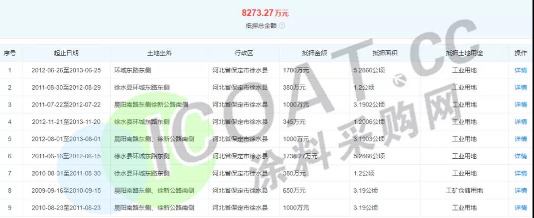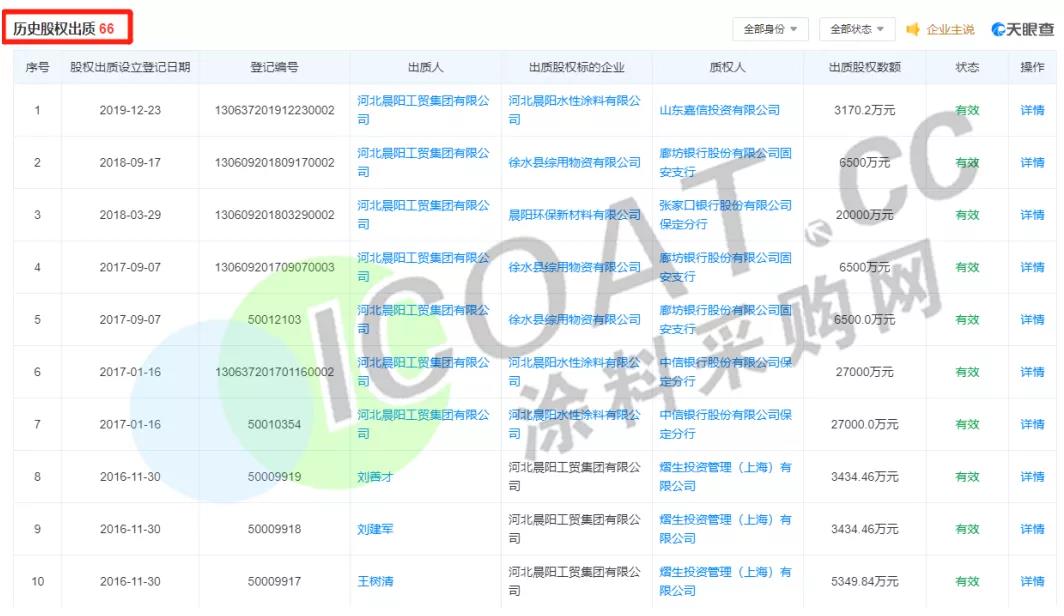 另据涂料采购网了解,自2012年以来,在10年时间里,晨阳股权出质高达66次,涉及金额达上百亿。进行土地抵押9次,涉及金额8273.27万元……