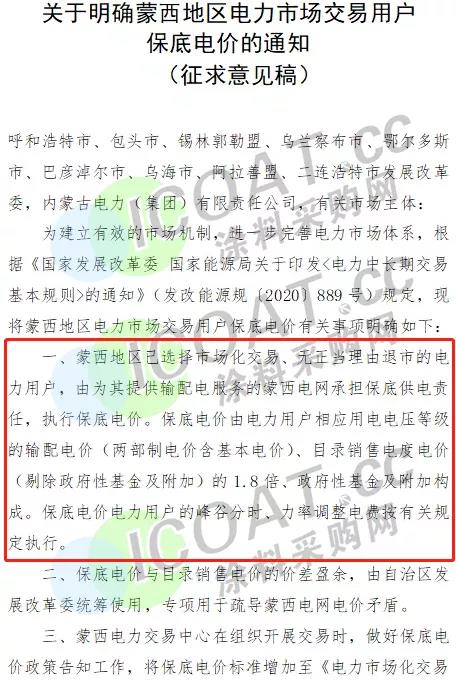 内蒙古发改委提出《关于明确蒙西地区电力市场交易用户保底电价的通知》中的保底电价比原有电价上浮了80%。