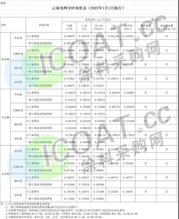 云南发改委发布公告《关于进一步完善分时电价机制的通知(征求意见稿)》。电度电价峰谷价差维持现行1.5:1:0.5,其中非市场化电量在目录丰枯电价基础上,峰时段电价在平时段基础上上浮50%,谷时段在平时段电价下浮50%;市场交易电量以当月电能量交易价格为基准,峰时段电价上浮50%,谷时段电价下浮50%。