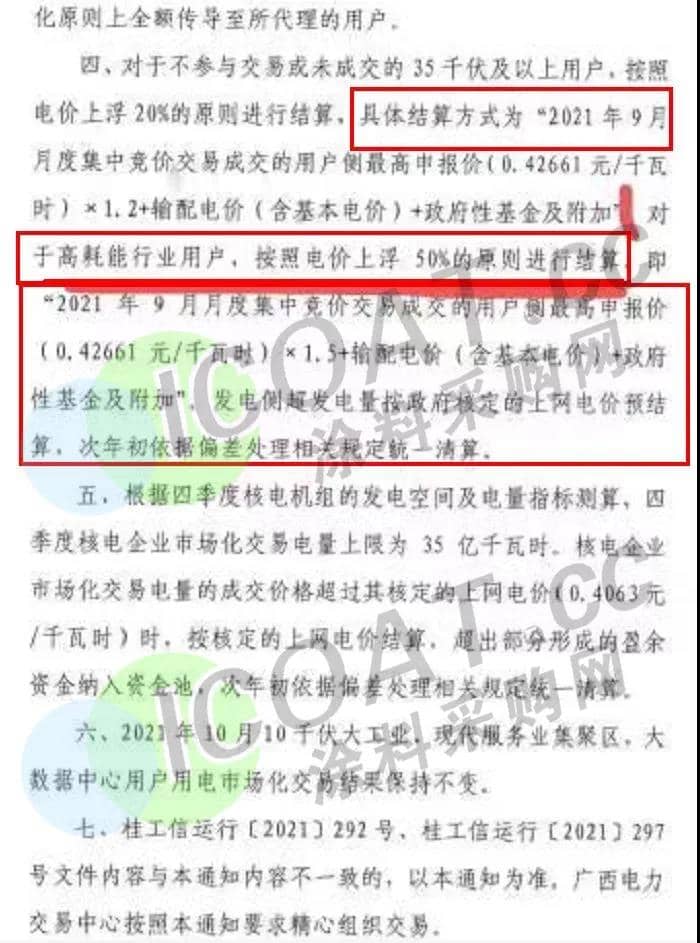 广西发布《自治区工业和信息化厅关于进一步调整2021年全区电力市场化交易方案的紧急通知》,在紧急通知中,高耗能企业电价直接上浮50%进行结算。