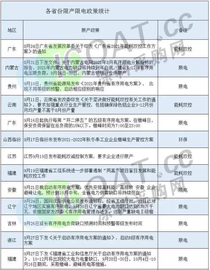 实际上,8、9月份就有部分地区出台电价改革方案,例如贵州、广东等省份先后发布通知,执行分时电价政策,在平段电价基础上,上、下浮一定比例,形成高峰电价和低谷电价。目前限电最严的地区是河南,目前电炉已全部停产,长流程限产30%;长三角地区电力缺口仍有,但10月电炉厂并未大面积停产,以错峰生产为主。以下是各省份限产限电的政策统计: