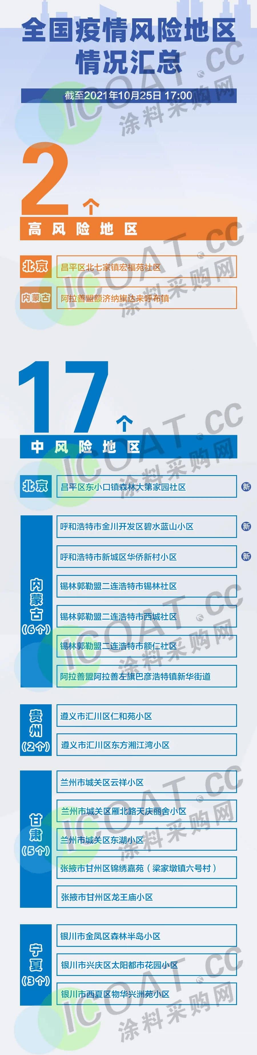内蒙古自治区二连浩特市锡林社区、西城社区、额仁社区划定为中风险地区,将锡林社区、西城社区、额仁社区辖区内的城建小区、龙城小区、汇通进口物流园区、公安小区东巷平房区、明达小区(东区)、枫华府第小区划定为封控区,中风险社区内其余区域为管控区。本公告自2021年10月21日12时起执行。
