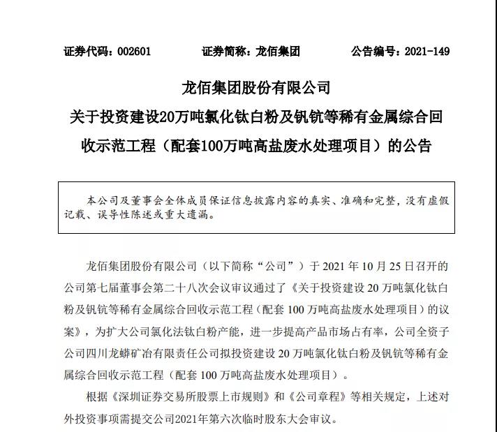 涂料采购网注意到,同日龙佰集团还发布一则关于“投资建设氯化钛白粉及钒钪等稀有金属综合回收示范工程”的公告。公告称,公司全资子公司四川龙蟒矿冶有限责任公司拟投资建设20万吨氯化钛白粉及钒钪等稀有金属综合回收示范工程(配套100万吨高盐废水处理项目)。此次投资旨在扩大公司氯化法钛白粉产能,进一步提高产品市场占有率。