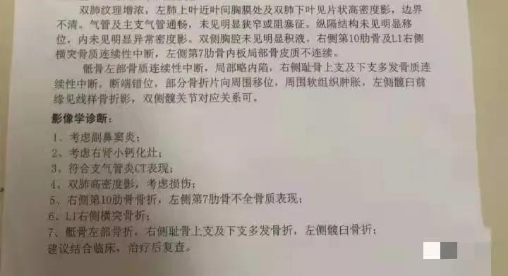 经鉴定,伤者右侧第10肋骨骨折,L1L2右侧横突骨折,骶骨左部骨折,右侧耻骨上支及下支多发骨折,左侧髋臼骨折等近10处骨折,以及多处内脏损伤。目前仍躺在ICU病房,一只眼睛发现出血点,存在失明可能……