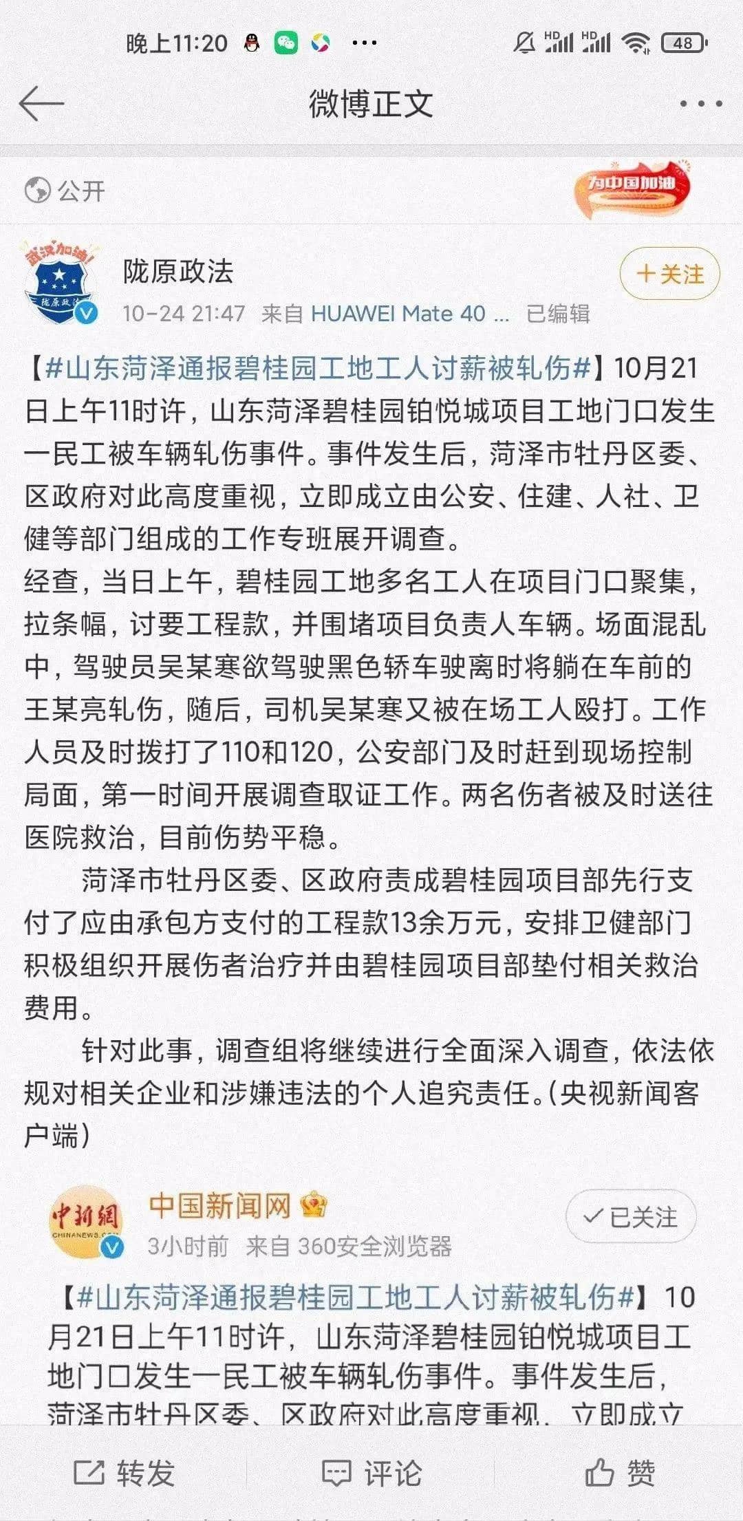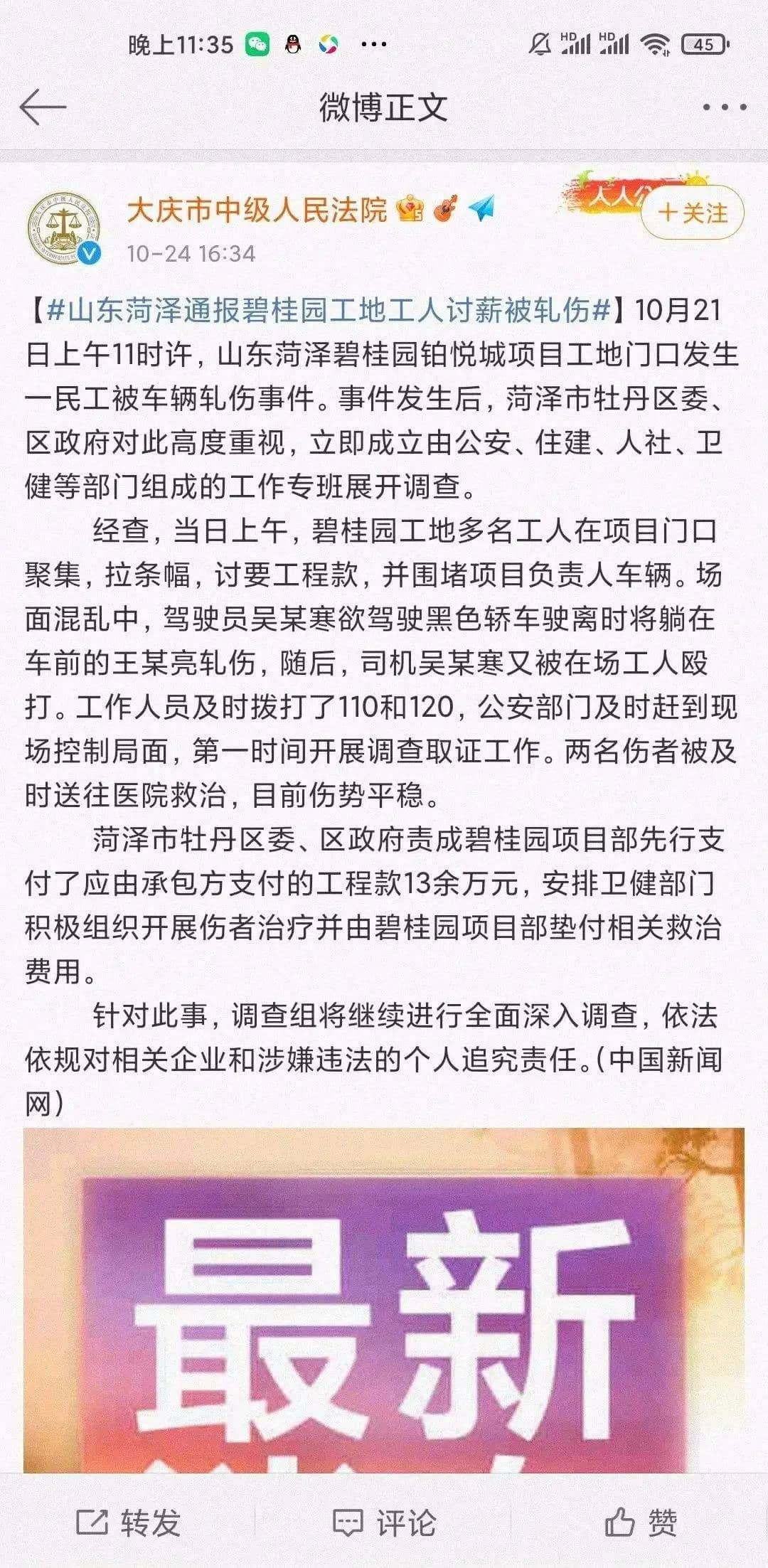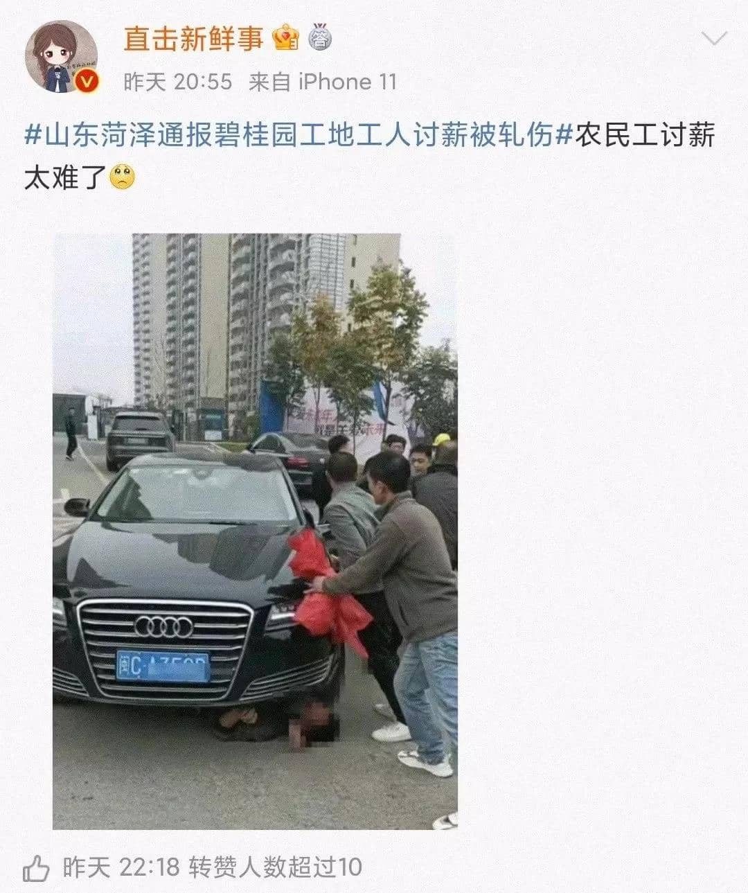 日前,山东菏泽碧桂园工地工人因为讨要工资,遭到车辆碾压。