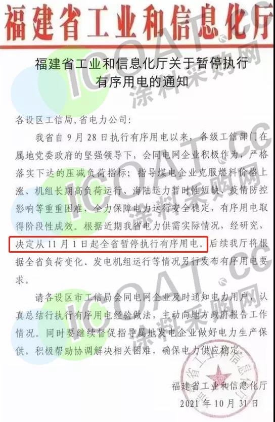 而在此前,福建省工业和信息化厅发布《关于暂停执行有序用电的通知》称,决定自11月1日起,全省暂停执行有序用电。