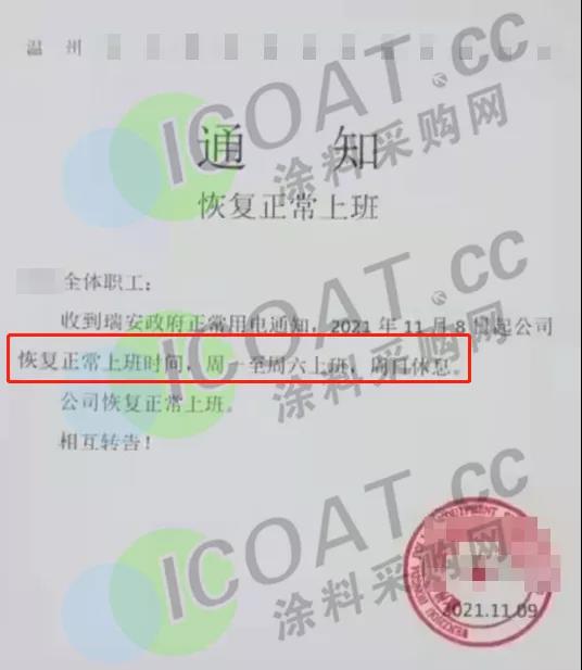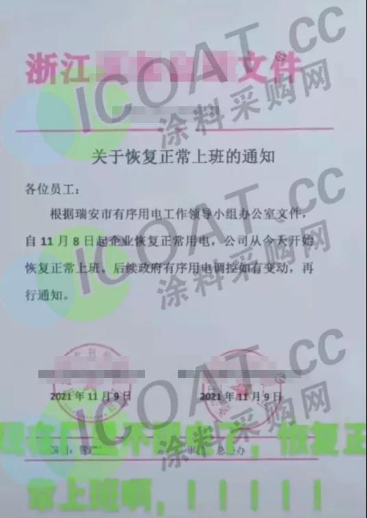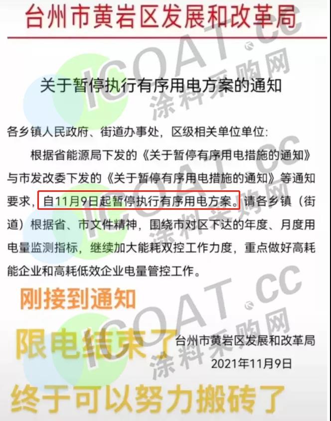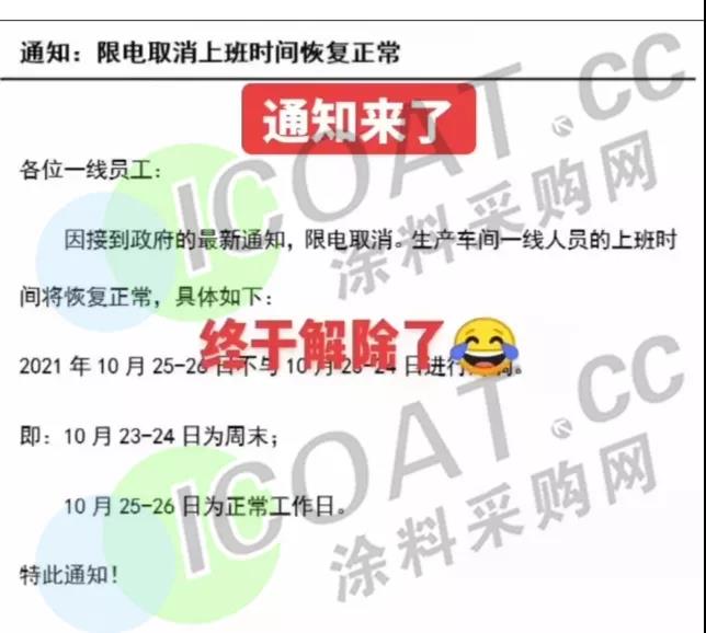涂料采购网从国家电网获悉,截至6日,除个别省份、局部时段对高耗能、高污染企业采取有序用电措施外,全网有序用电规模接近清零。国家能源局有关负责人表示:电力保供能力逐步增强,全国电力供需紧张形势已经有所缓解,未再出现拉闸限电现象。这也意味着,9月份以来的全国性限电情况基本结束!