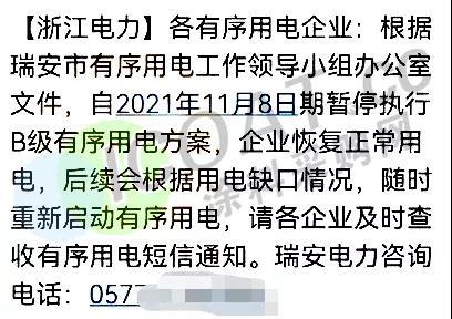 浙江瑞安:发布暂停有序用电短信通知,11月8日起暂停执行B级有序用电方案,企业恢复正常用电。