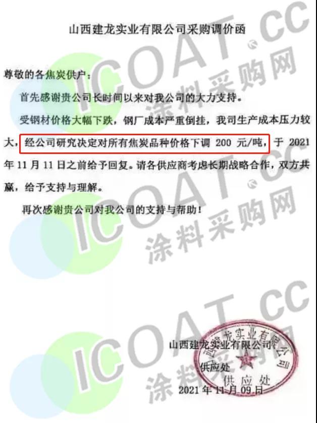 山西建龙实业通知,受钢材价格大幅下跌,钢厂成本严重倒挂,公司生产经营压力较大,经公司研究决定对所有焦炭品种价格下调200元/吨。