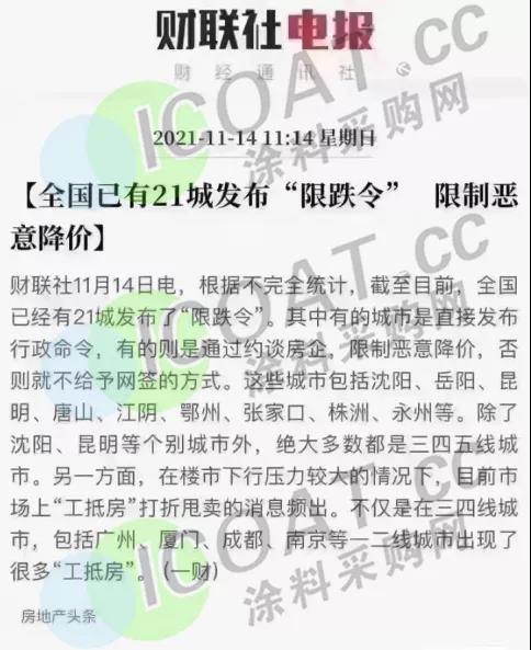 2021年即将迎来尾声,在“维稳”信号持续释放,“限跌令”快速铺开的形势下,楼市已经出现“暖阳”,涂料行业也似乎看到了久违的曙光。而这样的利好能否持续,让房地产产业链的涂料、化工等行业度过“至暗时刻”,涂料行业又能否再次迎来火爆的订单潮,值得我们拭目以待。