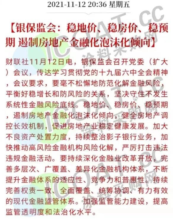 而后,央行发声,坚决遏制金融服务业领域的垄断和资本无序扩张,维护房地产市场平稳健康发展。银保监会同步发声表示,稳地价、稳房价、稳预期,遏制房地产金融化泡沫化倾向,健全房地产调控长效机制,促进房地产业稳定健康发展。