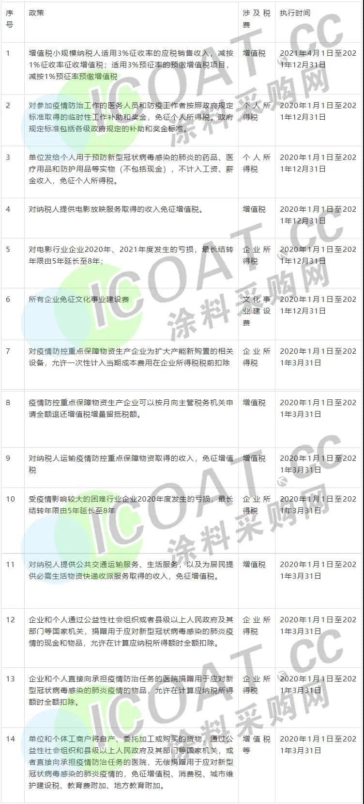 据涂料采购网了解,在2021年底前到期除了增值税减按1%之外,还包括免征文化事业建设费、单位发给个人的防疫用品等免征个税等多个优惠政策。