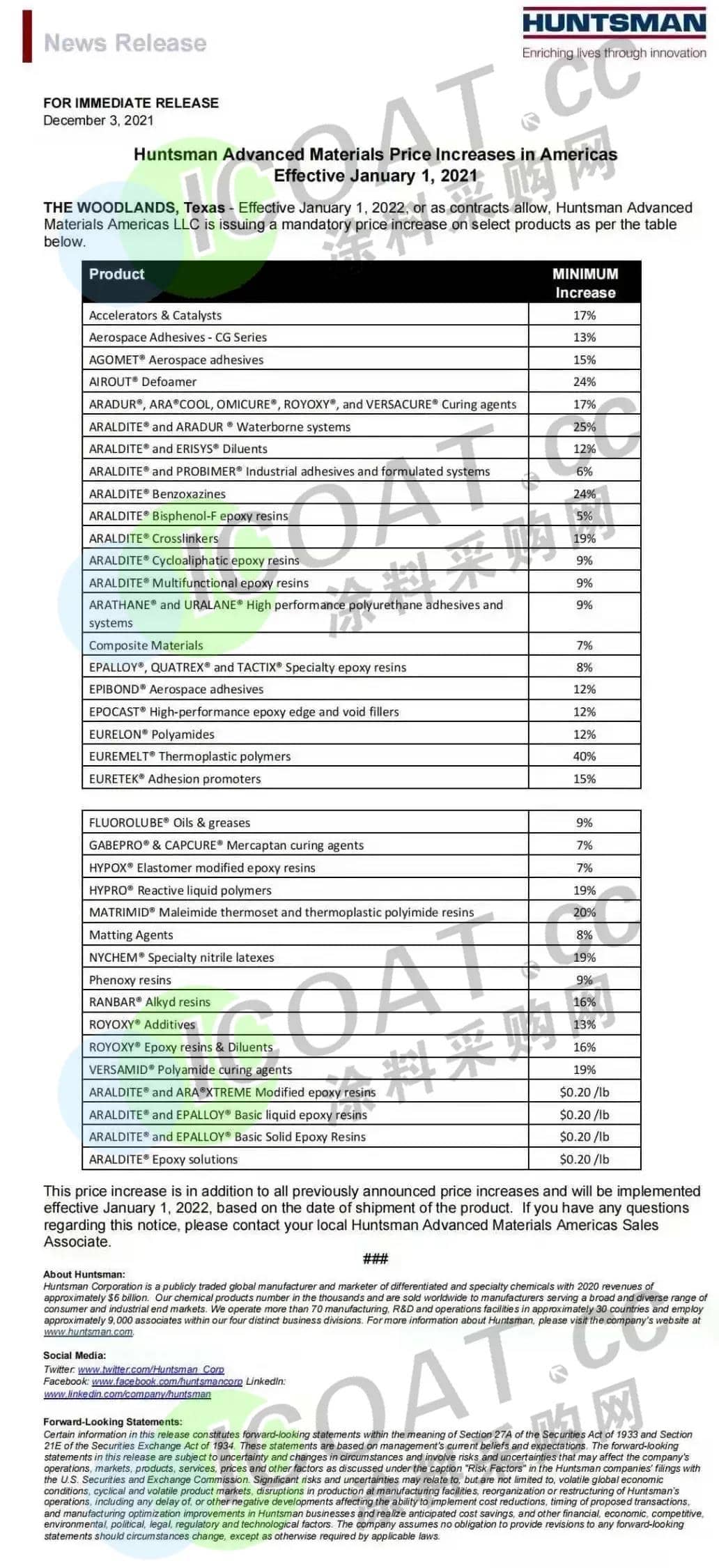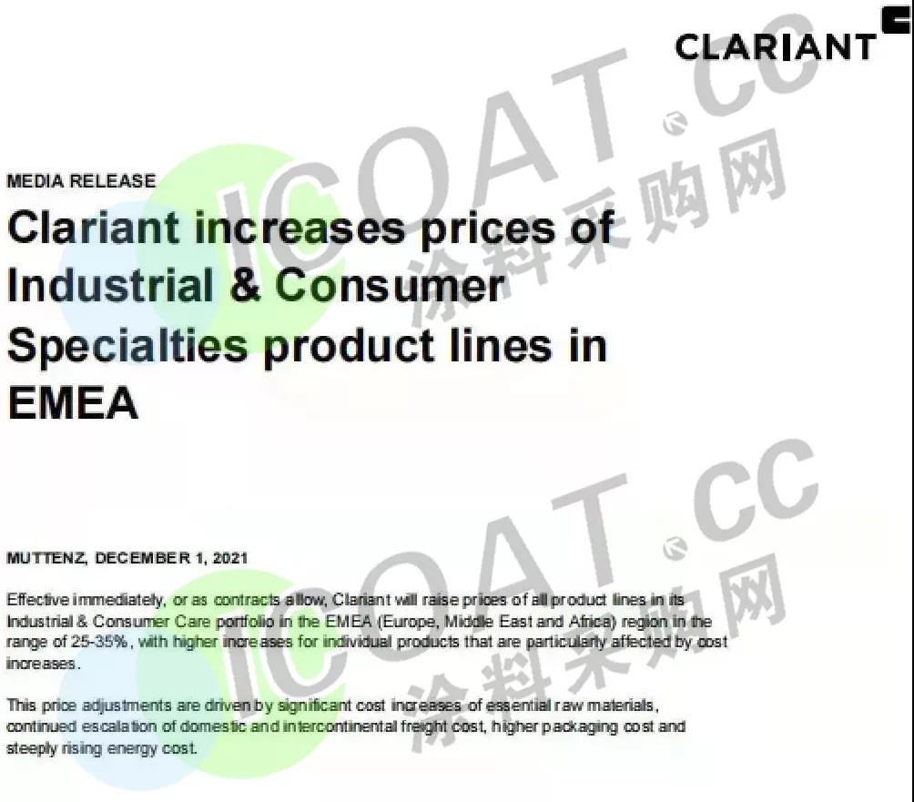 上调EMEA地区所有ICS业务部门(特种工业与消费品)所有产品的售价,涨幅在25%-35%之间。