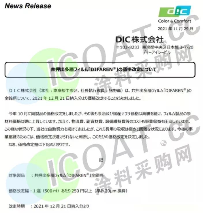 12月21日起DIFAREN® 热可塑性树脂制包装用多层共挤薄膜上调250日元(约14160元)/500平米(20μm换算)。