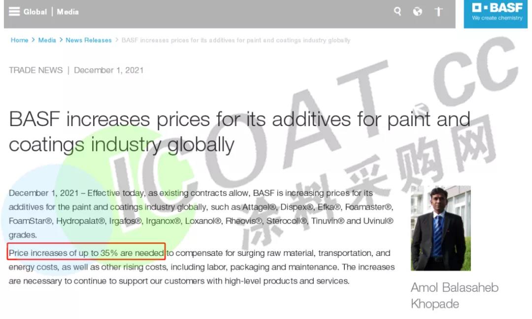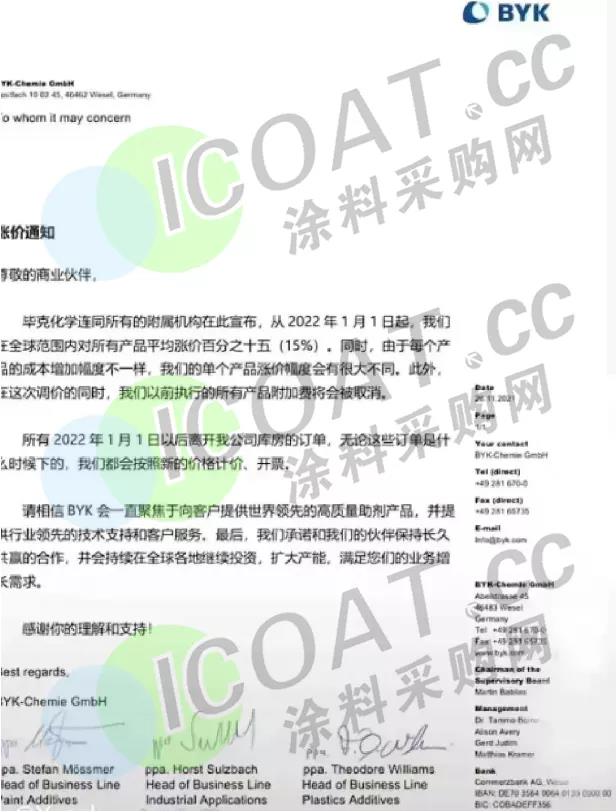 在全球范围内上调其油漆和涂料行业助剂的价格,包括Attagel®、Dispex®、Efka®、Foamaster®、FoamStar®、Hydropalat®、Irgafos® 、Irganox®、Loxanol®、Rheovis®、Sterocoll®、Tinuvin® 和 Uvinul® 系列。新价格立即生效,或根据合同条款允许生效。 此次价格增幅将达35%,此举是为了应对原材料价格、运输和能源成本的大幅上涨,以及劳动力、包装和维护成本的上升。