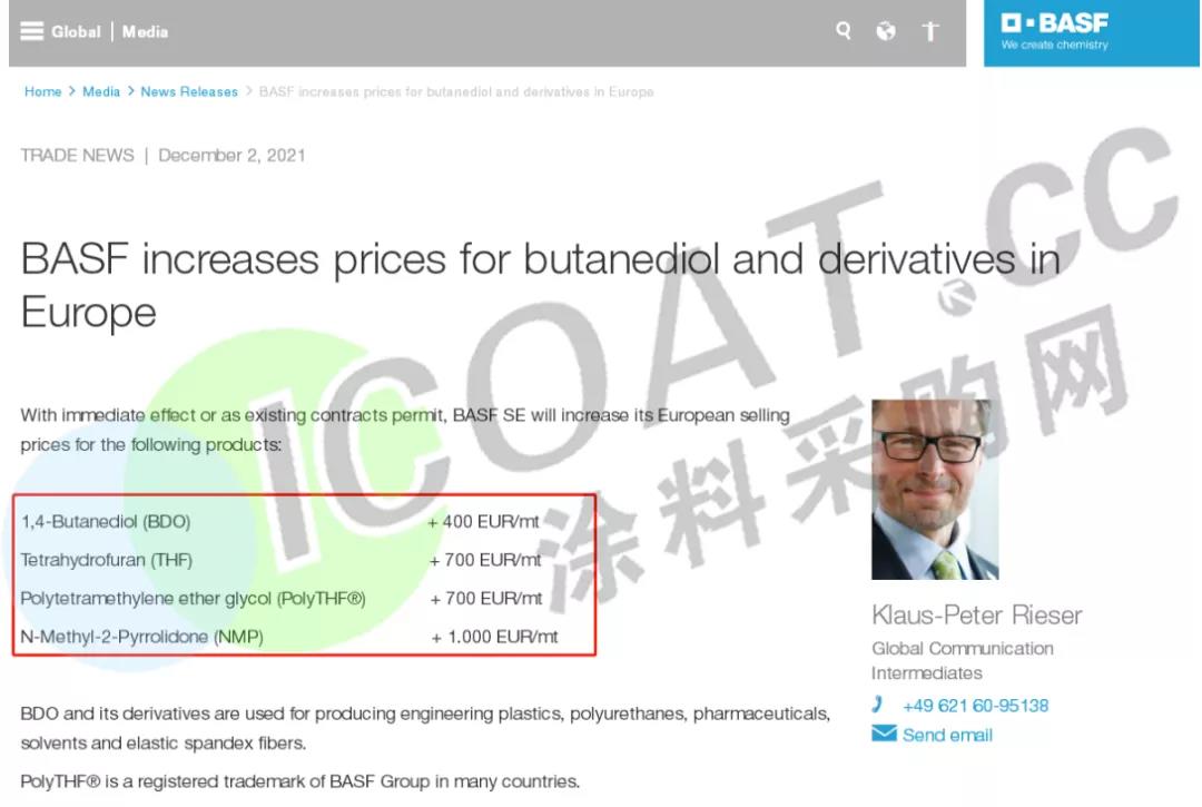 上调欧洲地区丁二醇及其衍生物的价格: